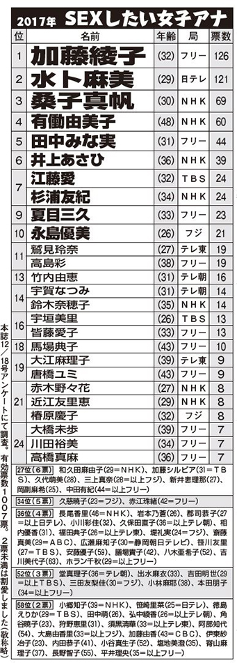 9位は朝の顔の2人、『あさチャン!』(TBS系)の夏目三久と『めざましテレビ』(フジ系)の永島優美アナが並んだ。「永島アナの、くっきりフェイスとナイスバディで朝から勃ちっ放し。たまに抜いてから出勤することもありマス」(35・寿司職人) 手は洗ってください!